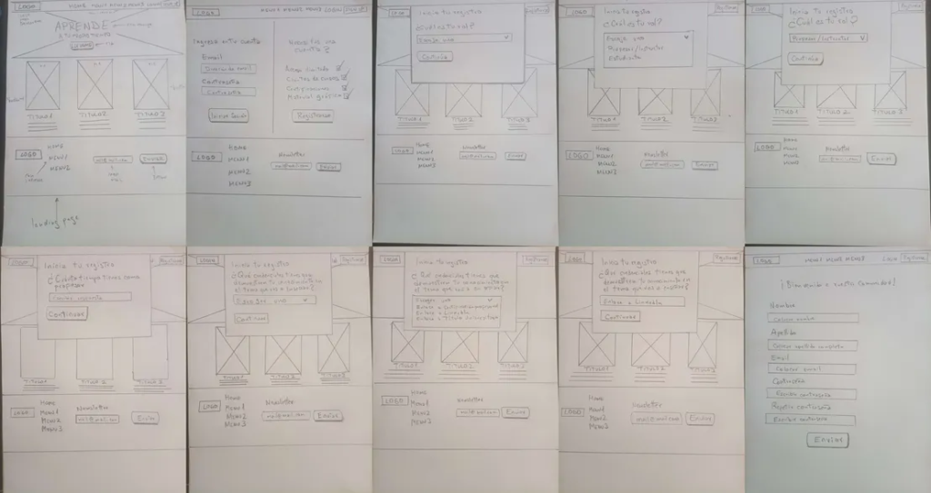 The first week was all about groundwork. I conducted intensive desk research to understand the current e-learning landscape, identifying trends and key competitors. Using the Crazy 8s brainstorming technique, I generated multiple design concepts, quickly sketching out ideas.